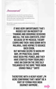 The 21-year-old thanked her well-wishers while also wishing good luck to her fellow contestants. The Femina Miss India 2022 pageant is set to take place on 3rd July 2022 at the Jio World Convention Centre, Mumbai. However, the competition would not see any representation from Tamil Nadu this year.