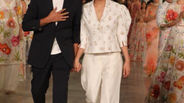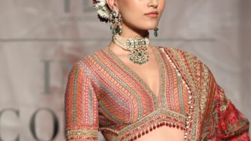 Exhuberating flamboyance in a tone-on-tone embellished shwerwani, actor Arjun Kapoor walked the ramp in the night’s highlight piece crafted with signature hems and ornamented with polki buttons. The actor was cheered on by Malaika Arora who was also wearing a Kunal Rawal number – a bandhgala with a cropped top and skirt which was fashioned in golden waffle embroidery. Other notable people in attendance were – Anaita Shroff Adajania, Mohit Marwah and Antara Motiwala, and designer Arpita Mehta.